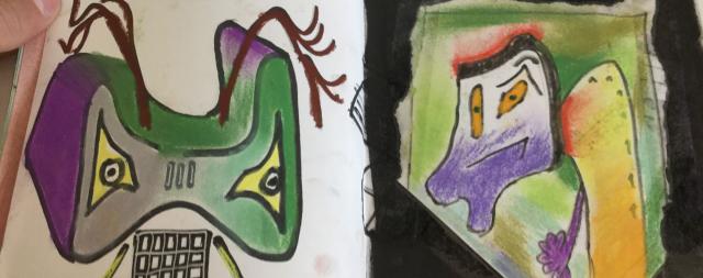 The intentional details are certainly what made these projects come to life. One artist book with a panda as the main character, called “Quarantine Days,” focuses on one positive of the quarantine—a break for the environment. One spread shows a high rise with myriad people and animals in the windows, an empty highway below and the words, “Most people are bored out of their minds from staying inside.” On the next page, below a drawing of the earth, the artist writes, “As everyone is inside, the earth is getting a break from lots of air pollution. This is a time for the earth to heal from an abundance of chaos.” Another art book, with but a few words, pictures Picasso-esque figures and faces evoking both amusement and despair. And another comic book, created simply in pencil, includes enlarged illustrated details like feline claws for “tools” to fight his foe, and close-up eyes that fill whole comic squares, underscoring the character’s shifting emotions.